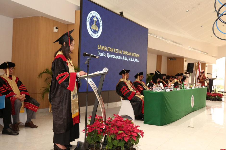 Selanjutnya, Ketua Yayasan Moriah, Denise Tjokrosaputro, B.Sc., M.B.A., M.A., menyoroti pentingnya menegakkan nilai kejujuran dan kesucian di tengah dunia pendidikan yang semakin pragmatis. Dalam sambutannya, ia menekankan bahwa krisis moral dan korupsi telah merusak sistem pendidikan, sehingga gereja dan lembaga teologi harus menjadi garda terdepan dalam mempertahankan kebenaran serta menanamkan nilai integritas kepada generasi penerus bangsa.