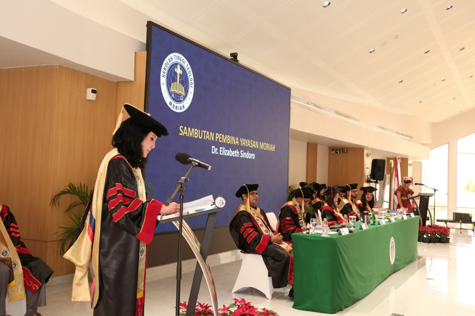 Sementara itu, Pembina Yayasan Moriah, Dr. Elizabeth Sindoro, memberikan apresiasi kepada seluruh jajaran STT Moriah yang terus menjaga keseimbangan antara kualitas akademik dan spiritualitas. Ia menegaskan bahwa keunggulan akademik tidak akan bermakna tanpa fondasi iman yang kuat. Dalam arahannya, beliau mengajak seluruh civitas academica STT Moriah untuk terus menjadi lembaga yang berpengaruh dan berintegritas, yang mampu memberikan dampak nyata bagi gereja, bangsa, dan masyarakat.