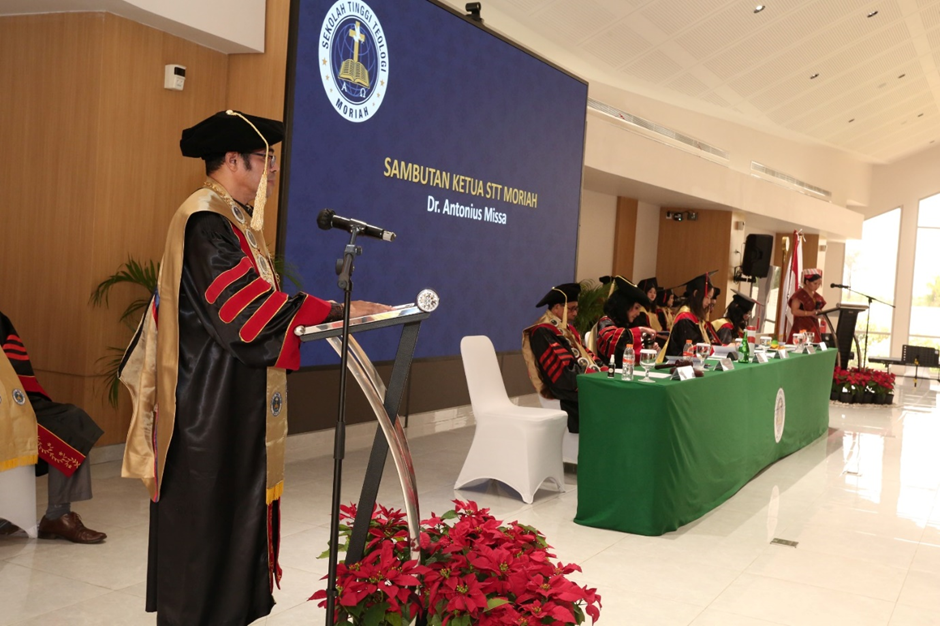Dalam sambutannya, Ketua STT Moriah, Dr. Antonius Missa, menyampaikan rasa syukur atas penyertaan Tuhan yang senantiasa menuntun perjalanan STT Moriah selama 18 tahun. Ia menegaskan bahwa keberhasilan akademik tidak hanya diukur dari pencapaian intelektual, tetapi juga dari pertumbuhan iman dan karakter yang mencerminkan Kristus. Pendidikan teologi, menurutnya, harus menjadi wadah pembentukan pemimpin yang rendah hati, melayani, dan berintegritas dalam menghadapi tantangan zaman.